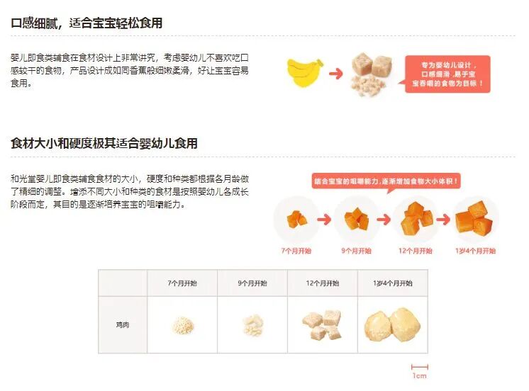 比如结合宝宝成长阶段的不同需要,为儿童的独特性而设计,对食物的大小、硬度、食量和食材的原味等都有不同的要求。如下图所示:7个月和9个月宝宝虽然相差2个月,但产品形态已经发生很大变化。