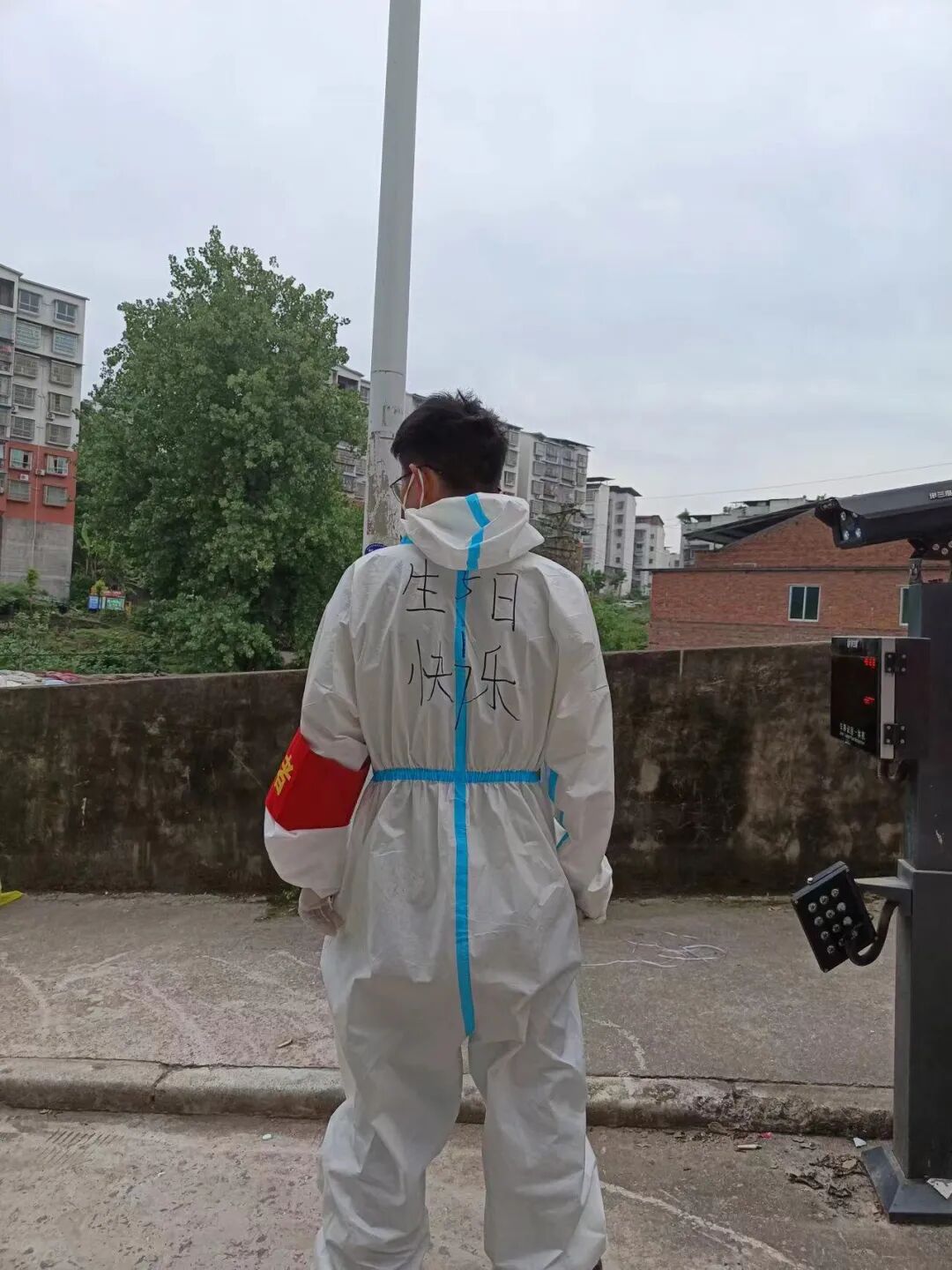 廖文吉23岁生日当天,请人在其防护服背后写上“生日快乐”