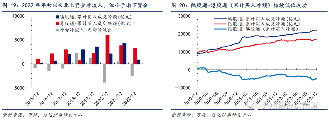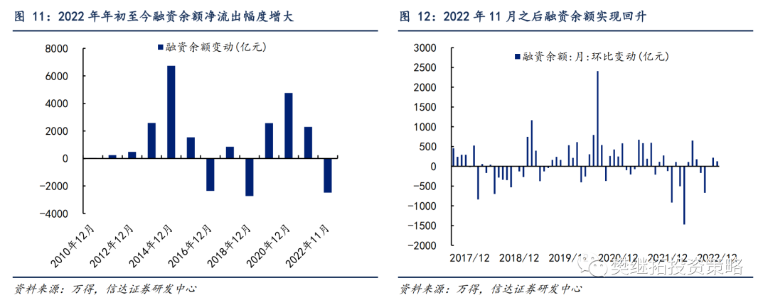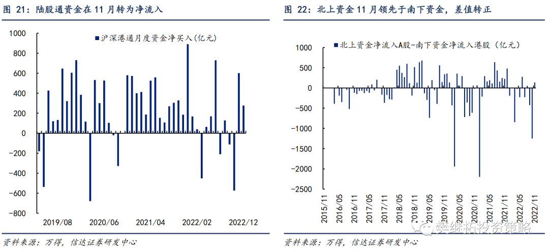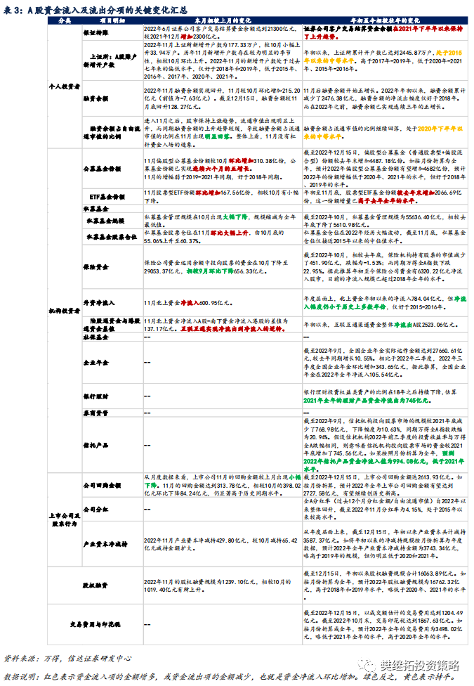 1)银证转账、融资余额、公募基金份额、北上资金等项目均会有净流入。2)居民资金入市的长期逻辑并没有被证伪,2023年还将有更大幅度的净流入。一方面,银证转账在2022年的下降幅度小于历次熊市,显示居民资金入市的长期逻辑并未被证伪。随着2023年下半年股市的企稳回升,银证转账有望回归正增长。另一方面,截至12月中旬,偏股型公募基金份额在2022年实现4000亿份以上的正增长,也好于历史上多次熊市。我们预计2023年偏股型公募基金份额有望实现6000亿额的正增长。3)私募基金仓位降至低点,未来加仓空间大。2022年以来私募基金仓位经历大幅波动,全年低点出现在4月、10月,与股市的两次年内低点基本匹配。4)外资净流入有望边际转好。外资在2022年的净流出主要受强美元、中国经济增速下行等的影响,随着美联储加息步长放缓、中国经济增速企稳回升,外资在2023年有望重回净流入。此外,考虑到南下资金的分流效应,我们预计2023年互联互通渠道对A股的净流入为0元,较2022年的-3300亿元大幅回升。5)股权融资、上市公司减持等项目的净流出金额可能会在股市回暖的背景下增加,但对整体资金格局的影响有限。居民资金入市的长逻辑尚未被证伪,这有望成为明年A股微观流动性上的潜在利多。最近几年疫情反复拖累居民消费倾向,居民储蓄率持续走高。而地产投资回报预期下降、理财产品收益率下行又导致居民投资渠道匮乏。以上两个因素共同推动居民资金向股票市场流入。证券客户交易结算资金的走势能很好地验证上述逻辑。2022年A股经历一定幅度的回撤,多数宽基指数都出现了技术性熊市,但个人投资者放在证券账户上的资金余额只有小幅减少,好于历史上多次熊市,显示居民资金入市意愿的韧性较强。往前看,我们认为一旦指数企稳,股市赚钱效应的负面压制因素缓解,叠加较高的居民存款,居民资金回流的速度有望比历史上更快。1.2 2022年年初以来多个资金净流入项目放缓,对全年资金格局构成拖累据不完全统计,截至2022年12月15日,A股净流出7714亿元。A股资金净流入额与自由流通市值的比例为-2.2%,低于过去三年,却好于2018年熊市期。 2022年年初以来资金净流入的放缓主要受到多个资金流入项的拖累。1)公募基金份额增幅下降。过去两年是公募基金发行大年,每年的份额增量均在10000亿份以上。但2022年以来,公募基金份额仅增长了4487亿份。2)私募基金份额变动不大,但股票仓位在2022年大幅波动。10月股票仓位达到年内最低点,11月略有回升,但股票仓位仍只接近2015年以来的中位值水平。3)互联互通渠道转为净流出。2022年年初至今北上资金累计净流入828亿元,弱于过去5年水平;同时南下资金净流入港股近3293亿元。2022年年初至今互联互通渠道上的资金净流出A股2465亿元。但微观资金面也存在结构性亮点。1)以保险为代表的配置型资金的净流入扩大,但对总量的影响尚有限。经我们估算,2022年年初以来保险公司资金有超过6000亿元净流入股市,净流入规模已超过2018年全年的水平。2)截至2022年6月,银证转账净流入2300亿元,显示个人投资者入市热情并未衰减,这在历史熊市上较为罕见。1.3 月度层面上,资金净流出持续改善,资金流入项实现大幅上升截至2022年11月,A股月度资金净流入占自由流通市值的比例为-0.32%,较10月的-0.54%有所回升。相较历史同期,11月的资金净流入低于2018年和2020年,高于2019年和2021年。2021年、2020年11月单月资金净流入占自由流通市值的比例分别为-0.56%、-0.25%。过去12个月累计净流入占自由流通市值的比例截至11月底的数据为-1.83%,较11月出现回升。 从分项上来看,11月资金格局边际转好主要由外资净流入回正、融资余额增长等资金流入项贡献。1)资金流入项目中,北上资金大幅流入601亿元,较10月大幅上涨,环比涨幅达到1174亿元,叠加南下资金净流入港股464亿元,互联互通渠道有137亿元流入A股市场,相较10月净流出1249亿元大幅回正。融资余额在11月大幅回升,较10月环比增加215亿元。公募基金份额、公司回购较10月呈现小幅下降,公司分红进入淡季持续收窄。2)资金流出项目中,产业资本净减持由10月的65亿元上升至430亿元,增发由10月的438亿元上升至702亿元,资金流出均较10月明显增多。新增开户数在11月环比微升,处于过去七年来偏低水平