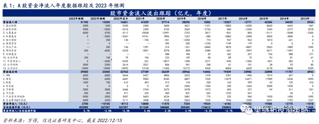 预计2023年A股资金净流入额占自由流通市值的比例将达到0.7%,较2022年的资金格局由负转正。
