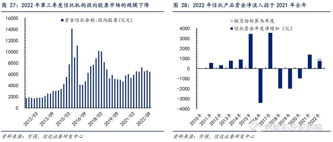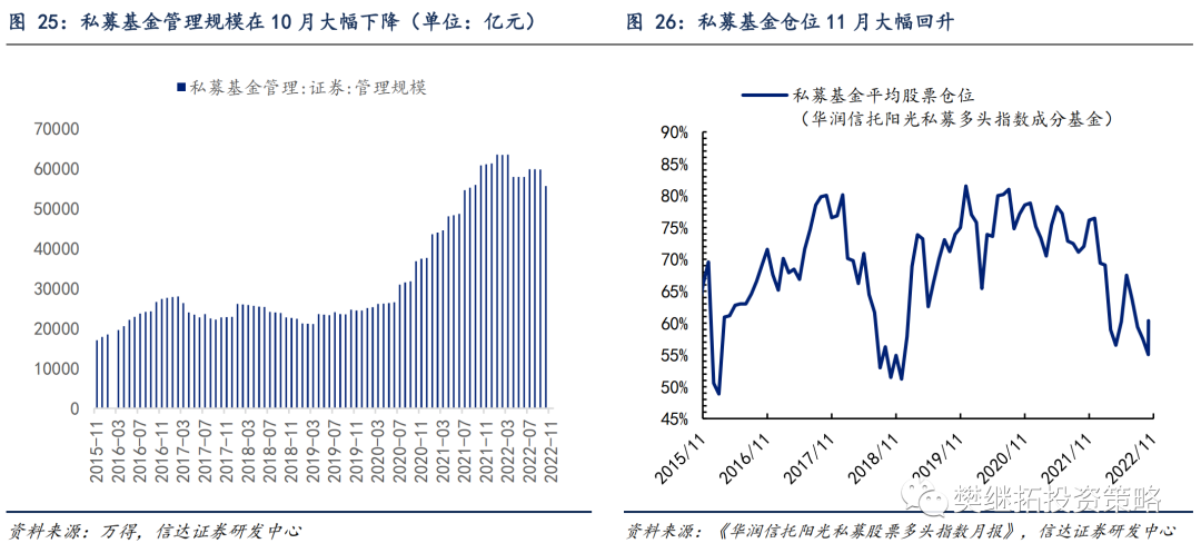 截至2022年12月15日,偏股型公募基金(普通股票型+偏股混合型)份额较2021年末增加4487.18亿份。如按月份折算为全年,预计2022年偏股型公募基金份额有望增加4682亿份,预计2022年的份额增幅低于2020年、2021年的水平,但好于2018年、2019年的水平。 从月度数据来看,11月偏股型公募基金份额较10月环比增加310.38亿份,公募基金份额已实现连续六个月的正增长。11月的增幅弱于2019-2021年同期,好于2018年同期。2022年年初至2022年11月底,股票型ETF基金份额较去2021年末增加2066.69亿份,这一份额增量已高于2021年全年的水平。从月度数据来看,11月股票型ETF份额环比增加167.56亿份,相较10月有小幅下降。年度层面上,北上资金2022年年初以来的净流入784.04亿元,但净流入幅度仍小于历史上多数年份,仅好于2015-2016年。南下资金2022年年初以来净流入港股3293.01亿元。2022年年初以来,互联互通渠道资金整体净流出A股2465.36亿元。11月北上资金净流入600.95亿元;12月上半月净流入277.59亿元。11月南下资金净流入港股463.78亿元;12月上半月净流入32.36亿元。11月北上资金净流入A股-南下资金净流入港股的差值为137.17亿元,互联互通在11月由净流出转为净流入。4.3 保险机构持有股票的市值略低于2021年底水平 从年度数据来看,截至2022年10月,相较2021年底,保险机构持有股票的市值减少了451.90亿元,跌幅为-1.53%;而同期万得全A指数下跌22.95%。据此推算2022年年初至今保险公司资金有6320.22亿元净流入股市,目前的净流入规模已超过2018年全年的水平。从月度数据看,保险公司资金运用余额中投向股票的资金在10月下降至29053.37亿元,相较9月环比下降656.33亿元。4.4 私募基金管理规模大幅下降,股票仓位实现大幅回升管理规模方面,截至2022年10月,私募基金管理规模为55636.40亿元,相较2021年底下降了5610.98亿元。私募基金管理规模在10月出现大幅下降,规模缩减为全年最低值。假设偏股型私募基金规模占比稳定(2018年末为股票型基金25%,混合型基金34%),预计偏股型私募基金规模相较2021年底减少了3366.59亿元。股票仓位方面,私募基金股票仓位在11月实现大幅回升。华润信托阳光私募多头指数成分基金的股票仓位在11月环比大幅上升,由10月底的55.06%上升至60.37%。2022年以来私募基金仓位经历大幅波动,1-4月大幅下降,5-6月快速回升,7-10月再次回落,11月再次回升,其中10月的私募基金股票仓位为年内最低点。4.5 信托机构投向股票市场资金规模小幅下降,企业年金净流入幅度增加截至2022年9月,信托机构投向股票市场的规模较2021年底减少了768.98亿元,下降幅度为10.63%,同期万得全A指数跌幅为20.94%。假设信托机构2022年前三季度的投资收益率与万得全A跌幅相同,则意味着信托机构投向股票市场的资金较2021年底增加了745.56亿元。如果按照月份折算为全年,预测2022年信托产品资金净流入值为994.08亿元,低于2021年水平。截至2022年9月,全国企业年金实际运作金额达到27660.61亿元,较2021年同期增长10.55%。相比于2022年二季度,2022年三季度全国企业年金环比增加343.65亿元,据此推算,全国企业年金在2022年全年净流入105.54亿元。5.1上市公司回购金额在11月继续维持高位