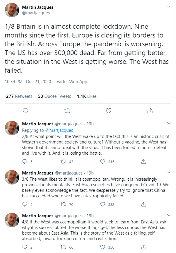 被中国网友善意调侃为“知名中吹”、“英国开眼看世界第一人”的学者马丁·雅克(Martin Jacques)于12月21日,连发8条推特,直言“西方失败了”。