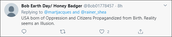 一位坐标是美国佛罗里达州的网民评论称,“美国是在压迫下诞生的,民众从出生起就接受政治宣传。现实如同一个幻象。”