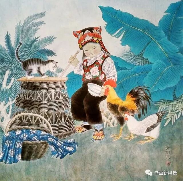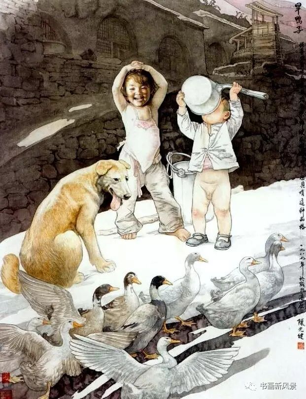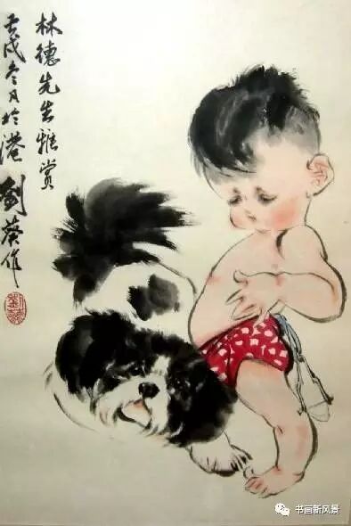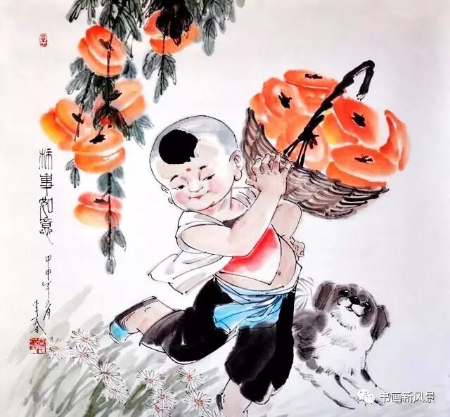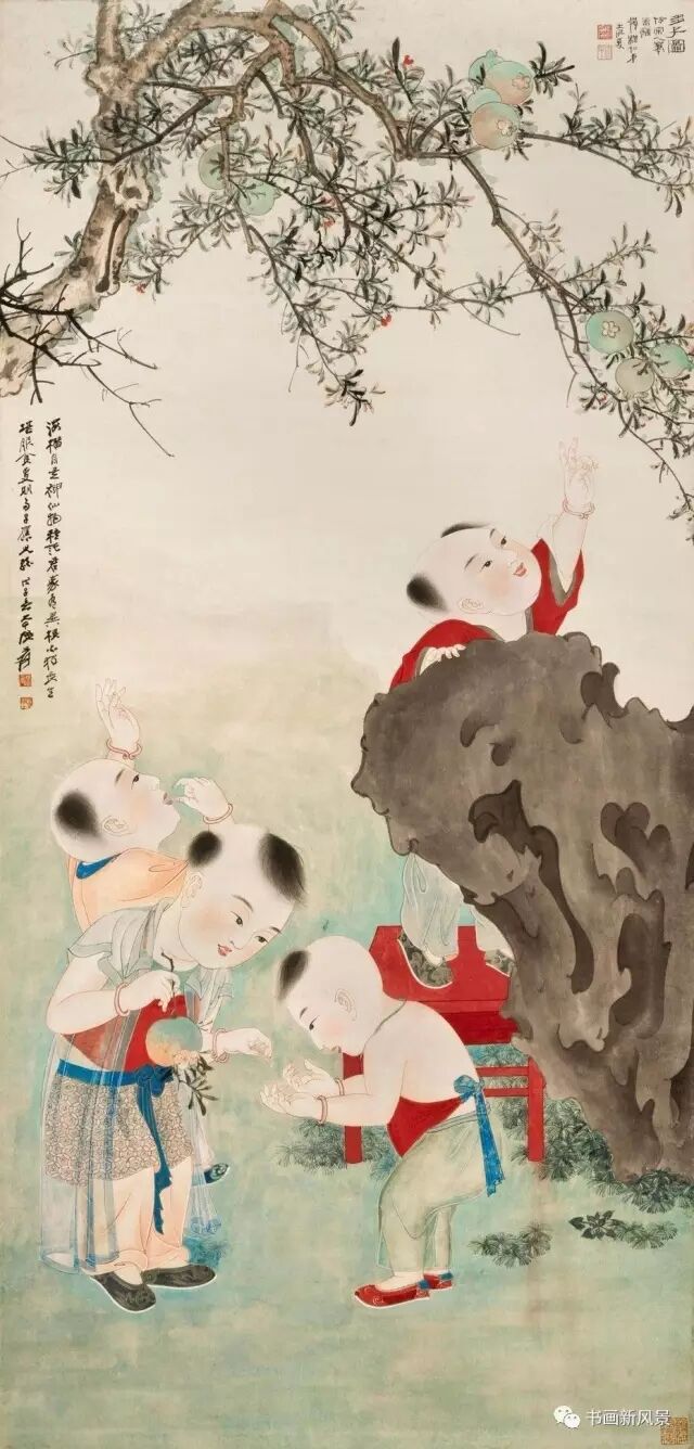 张大千这幅《多子图》,展现了童子爬上假山采摘并玩耍石榴的场景。以儿童为主题的画作,在收藏界被称为婴戏图,画面多是儿童作玩耍姿态,生动有趣,呈现出热闹欢乐的喜庆气氛。而石榴在传统的吉祥图案中象征着“多子多福”。在这幅画中,儿童与石榴都寓意着“多子”,可谓吉祥至极。