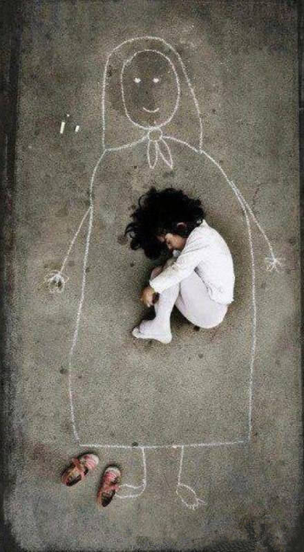 在伊拉克,一个没有妈妈的小女孩,在孤儿院的水泥地面上,画了一个妈妈。