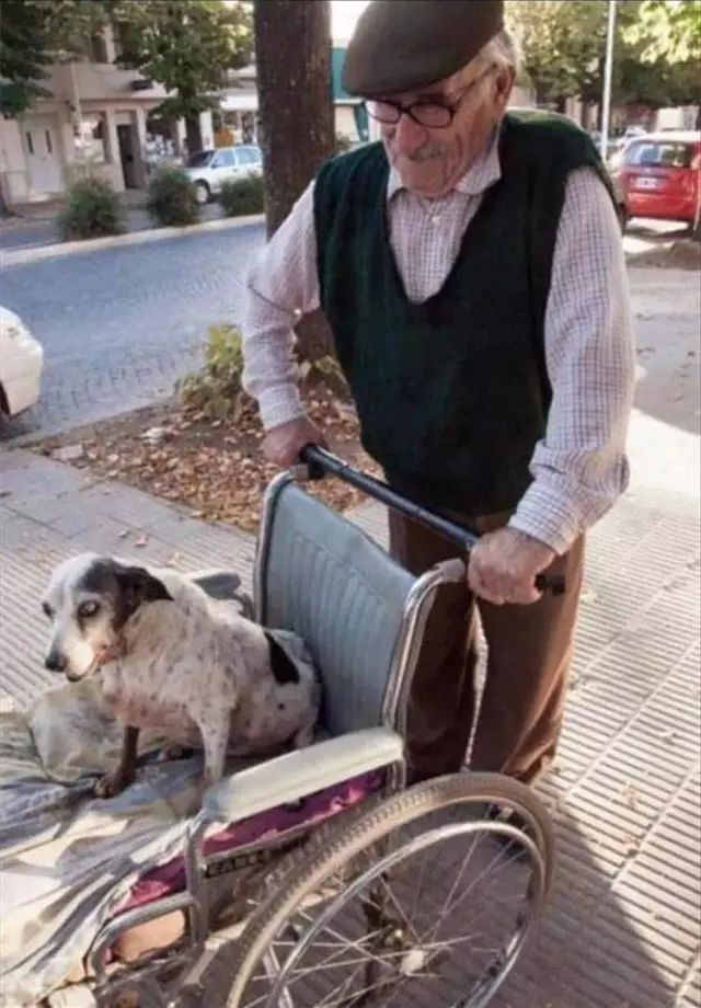 年迈的老爷爷正推着坐轮椅的狗狗遛弯。原来狗狗也老了,已经不能再走路了,所以特地准备了轮椅,每天照旧带狗狗出门散心。