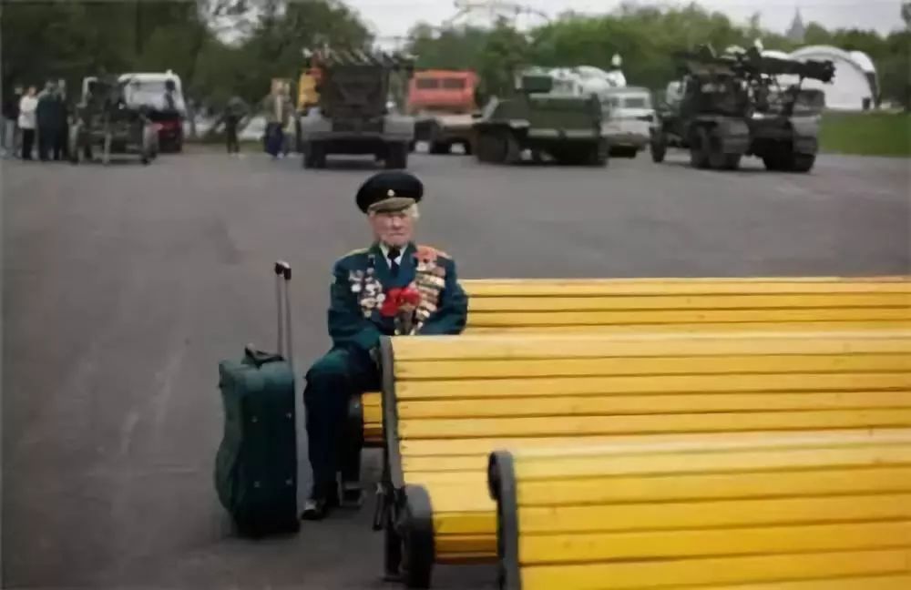 二战老兵坐在联椅上等待,希望能看到他部队的战友。