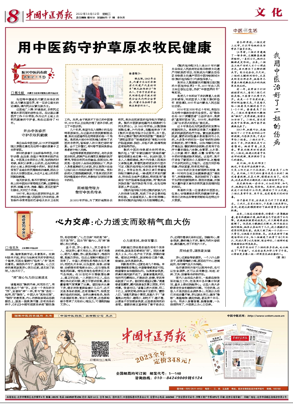 这十年我也在为少数民族医药的发展与挖掘而努力。我到牧区收集了大量蒙古族的治疗方法。蒙古族是游牧民族,蒙药的剂型基本都是散剂与小丸药,大多是中药材加一些矿物药和动物药制成的,便于携带。比如用酸马奶治疗高血压、糖尿病和结核病;还有用于治疗中暑的清血八味散,由紫草、土木香、人工牛黄、栀子、瞿麦、石膏、甘草等八味中药材研磨成粉末制成。这些年,我不仅学会了蒙医的小儿捏脊疗法,还整理了许多民间的土方验方。这些方剂价格低廉、疗效显著,很有实用价值。