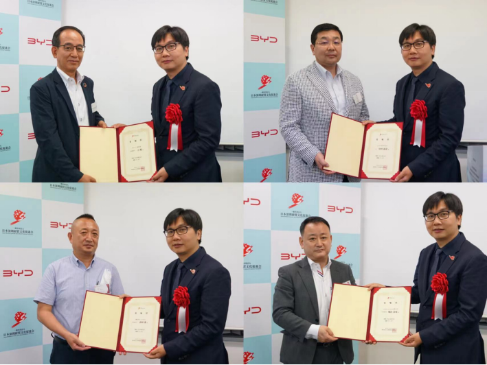 接下来,刘学亮社长与翁道逵会长交换签署战略合作意向协议书,并在来宾们的掌声中合影留念。这也标志着,深促会与比亚迪汽车日本分公司就中国民族品牌汽车——比亚迪进入日本市场的10辆新能源汽车达成购买意向。