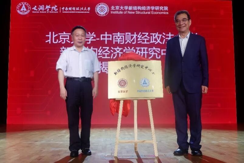 5月26日上午,北京大学-中南财经政法大学新结构经济学研究中心成立揭牌仪式在中南财经政法大学南湖校区艺体中心举行。中南财经政法大学校长杨灿明、北京大学新结构经济学研究院院长林毅夫先后致辞。杨灿明校长对林毅夫院长及全国各院校新结构经济学中心学科负责人的到来表示热烈欢迎,并表示北京大学-中南财经政法大学新结构经济学研究中心的成立将深化双方在学术建设、学科交流、人才培养等领域的合作,为推进新结构经济学学科发展、不断服务地方经济发展做出更大贡献。林毅夫院长对北京大学-中南财经政法大学新结构经济学研究中心的成立表示热烈祝贺,他表示新结构经济学是立足于中国与发展中国家经验的理论体系,发展潜力巨大,希望中南财经政法大学及各院校同仁共同努力推动新结构经济学的理论创新、深化与推广,更好地认识世界、改变世界,不辜负这个时代。在全场热烈的掌声中,杨灿明校长、林毅夫院长共同为北京大学-中南财经政法大学新结构经济学研究中心揭牌。