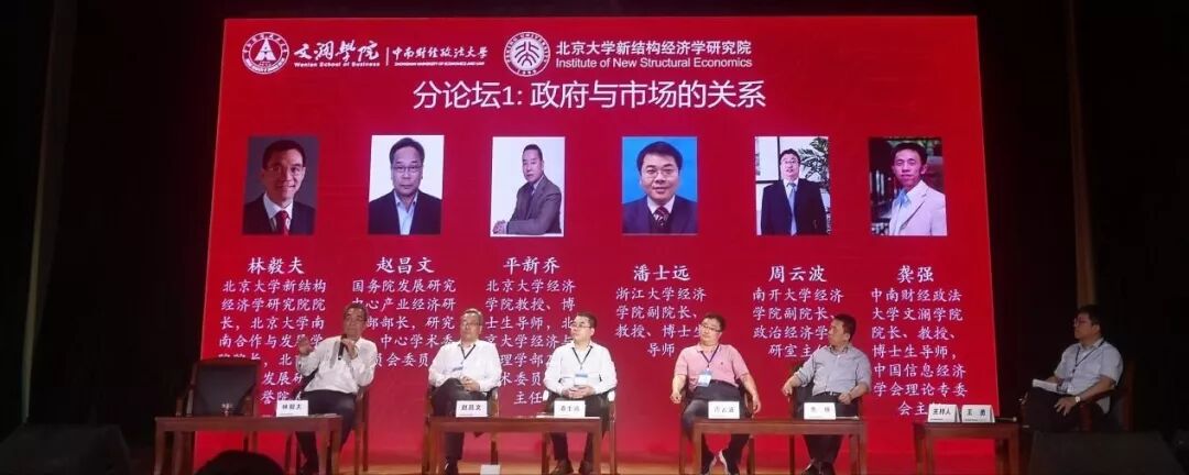 “产业升级与财政金融政策”高端圆桌论坛随后举行。在“分论坛一:政府与市场的关系”上,北京大学新结构经济学研究院院长林毅夫、国务院发展研究中心产业部部长赵昌文、浙江大学经济学院副院长潘士远、南开大学经济学院副院长周云波、中南财经政法大学文澜学院院长龚强围绕基础设施、国有企业、政府作用的效果等议题展开对话。北京大学新结构经济学研究院学术副院长王勇主持分论坛。
