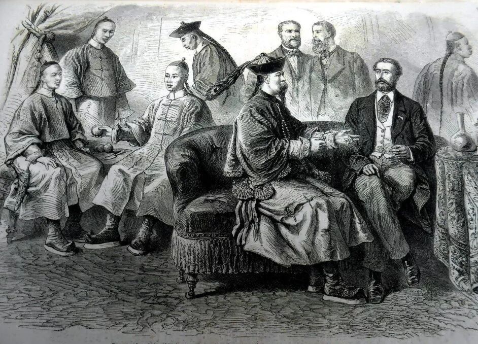 表现1866年中国使团在巴黎的版画(Paris - La mission chinoise et ses interpretes réunis dans leur salon de compagnie . in Monde Illustré , mai