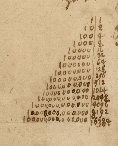 莱布尼茨在1696年5月与鲁道夫·奥古斯特公爵有一次私人谈话,提到了“创造意象”(创造形象)与二进制数字系统的联系——一种仅由数字0和1组成的双重系统。1697年1月,他在给公爵的信(在今天这封信被称为“新年之信”)中,描述了数学结构与对世界的神学—哲学解释之间的联系。他从创造意义上解释了他的二进位制:整个世界都来自无(即零)和上帝(即一)。左图为莱布尼茨给公爵的信;右图为莱布尼兹以金字塔形式书写的二进制代码(来源:dokumente.leibnizcentral.de)