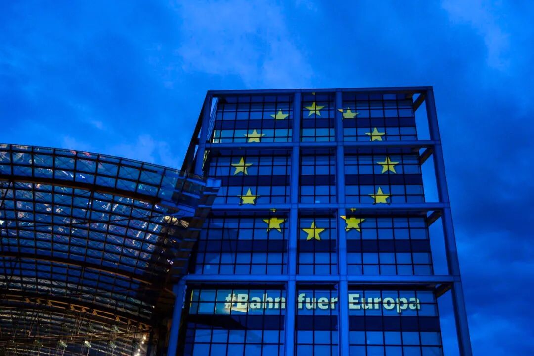2019年5月6日,德国柏林火车站出现的一面巨大的欧盟旗帜(来源:theinitium.com)