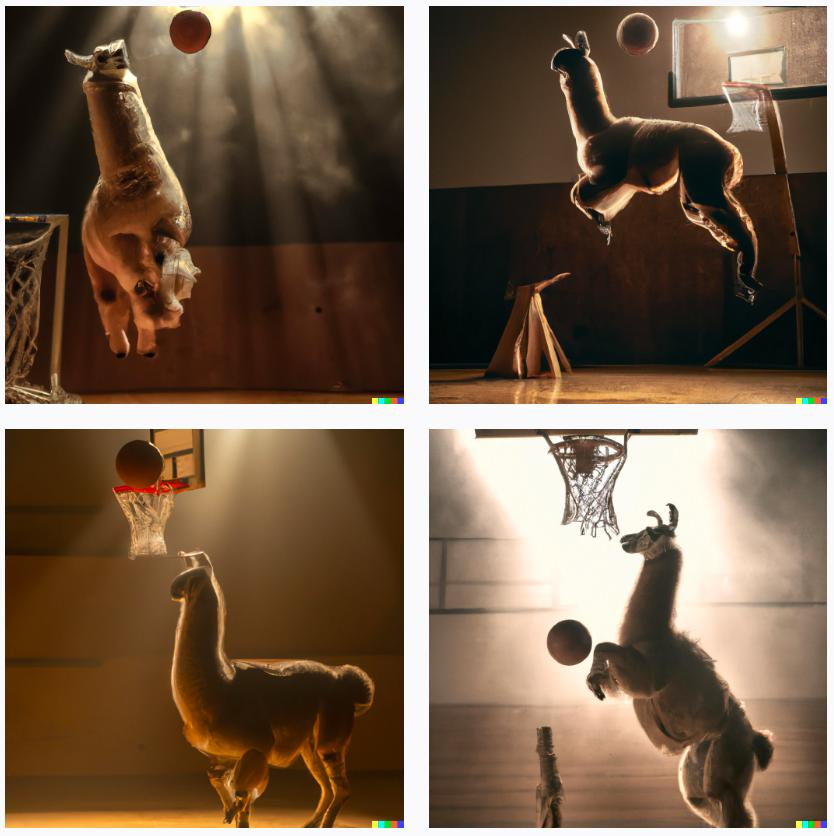 今年4月份,OpenAI发布的第二代DALL·E 2模型,再次为图像生成领域树立了全新标杆,可以通过简短的文本描述(prompt)来生成相应的图像,使得不会画画的人也可以将自己的想象力变为艺术创作,例如“羊驼打篮球”这句话生成的四张图片看起来就非常符合大家预期的想象。