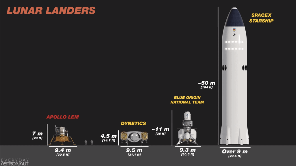 并且在阿尔忒弥斯计划中,入围计划的选手们不仅要给出不同的着陆器方案,还要自行发射,不能够使用SLS。其中最有看点的自然是SpaceX、蓝色起源、Dynetics之间的竞争。