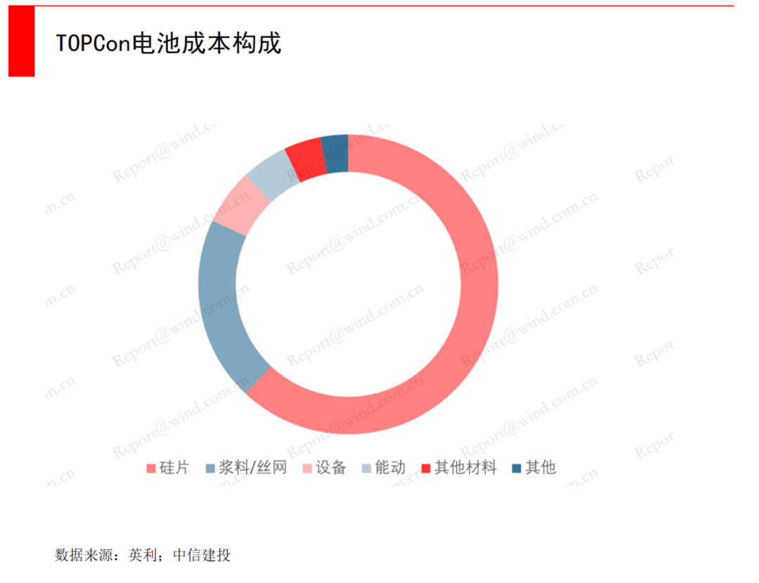 光伏电池的成本,主要包含两大类:一类是涉硅成本,一类是非硅成本。涉硅成本主要是硅片;非硅成本主要有浆料、靶材等,其中成本占比高的是浆料,TOPCon在制备中需要用高温银浆。一般情况下,其成本占比分别为硅片62%、浆料20%、其他6%,硅片与浆料成本占比超过80%。