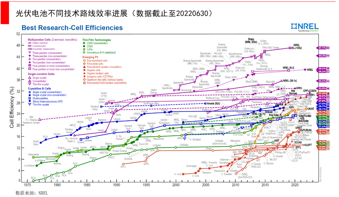 而在经济性背后,是技术进步。光伏行业是残酷的,一旦新技术取得LCOE(平准化度电成本)优势,旧技术就几乎会被完全淘汰,在同一应用场景下LCOE是评价光伏技术的唯一标准,没有共存的可能,没能及时转型的公司也会因此破产。
