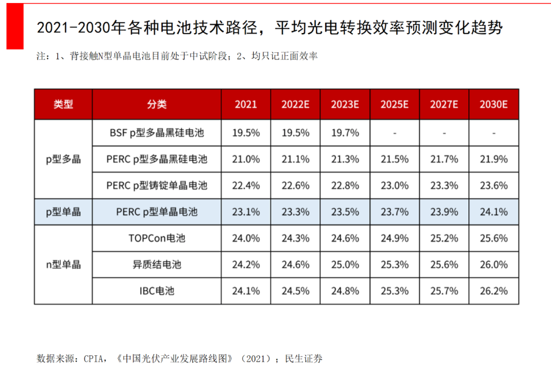 但在2016年之后,随着单晶的工艺更成熟,比如金刚线切割的技术突破,都使PERC电池技术更加成熟,体现出绝对成本优势,再加上PERC本身的光电转换效率更高,因此在2017-2021年左右,单晶的PERC快速完成了技术替代,从2016年的10%市场份额,一路杀到91%。