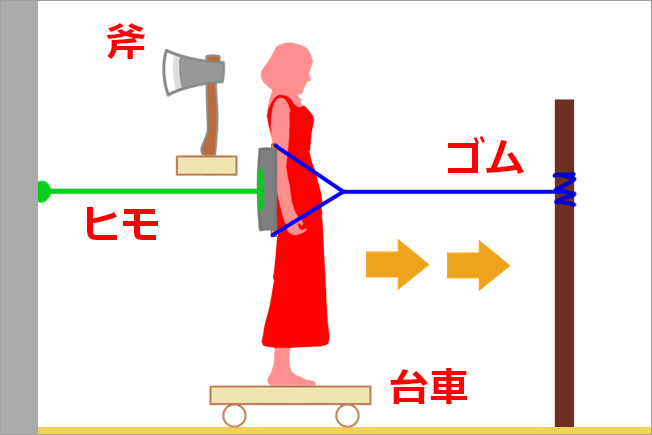 把橡胶拉到极限,然后在那儿放上女友并用绳子固定住,再在侧面放一把斧头。当斧头落下时,美少女接吻机被触发,她就会朝你走来...