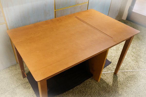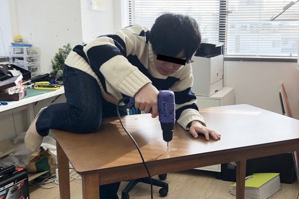 首先,要用电钻和锯子在桌子中间开一个洞: