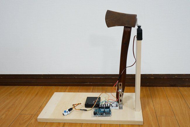 这是一把带声音传感器的斧头,当传感器采集到声音,斧头就会自动掉落了!