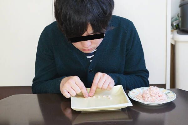 ARuFa认真地把蟹肉搓成小颗小颗的薄荷糖形状,再风干,装进盒子里: