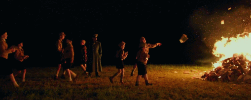 忘不了在训练营里,纳粹教孩子们焚书,他们在篝火旁一边舞蹈,一边嬉戏打闹: