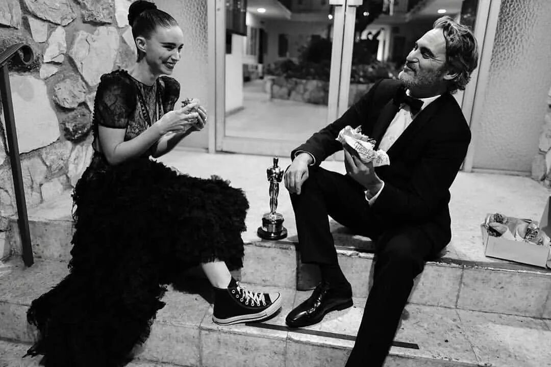 比起台上的光鲜,蝉主更爱他和未婚妻在后台吃汉堡的时刻:全无偶像包袱地席地而坐,华服之下,鲁妮踩着滑板鞋,小金人就摆在一边,太甜了。