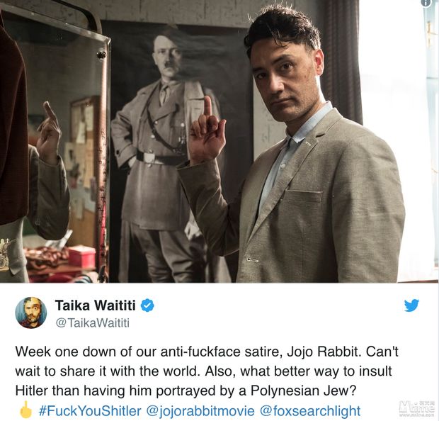 “乔乔兔”正式开拍,他不仅是导演,更亲自上场扮演希特勒,更在IG上分享了自己的片场照,对着希特勒照片竖中指:“还有比波利尼西亚犹太人扮演希特勒更佳的羞辱方式吗?”