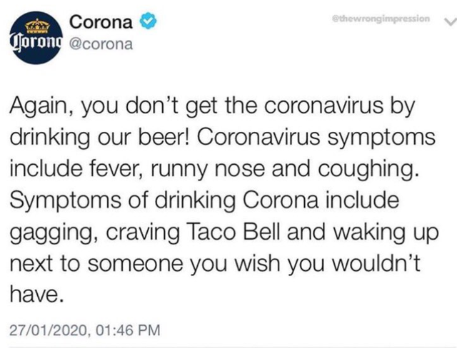 “再说一遍,喝我们的啤酒你不会得病!新冠病毒的症状包括发烧、流涕和打喷嚏,喝科罗娜的症状包括呕吐、想吃垃圾食品以及和你不希望发生的人搞一夜情。”