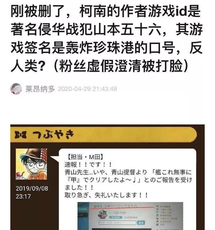 豆瓣上有人讨论,漫画作者青山刚昌,在一款游戏里的ID是 山本·哈洛克·五十六: