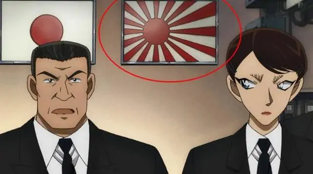 因为剧场版里有一幕,是墙上挂着两面旗帜:一面是日本国旗,一面是旭日旗。