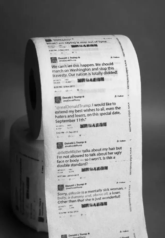设计师把特朗普在推特上离经叛道的言论,印在厕纸上,表达自己的不满: