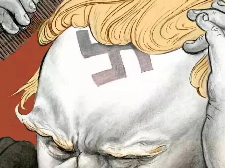 艺术家史蒂夫·布罗德纳的作品,颇有电影《小丑》内味——掀开川普的金色假发,他的头顶深深打着法西斯烙印: