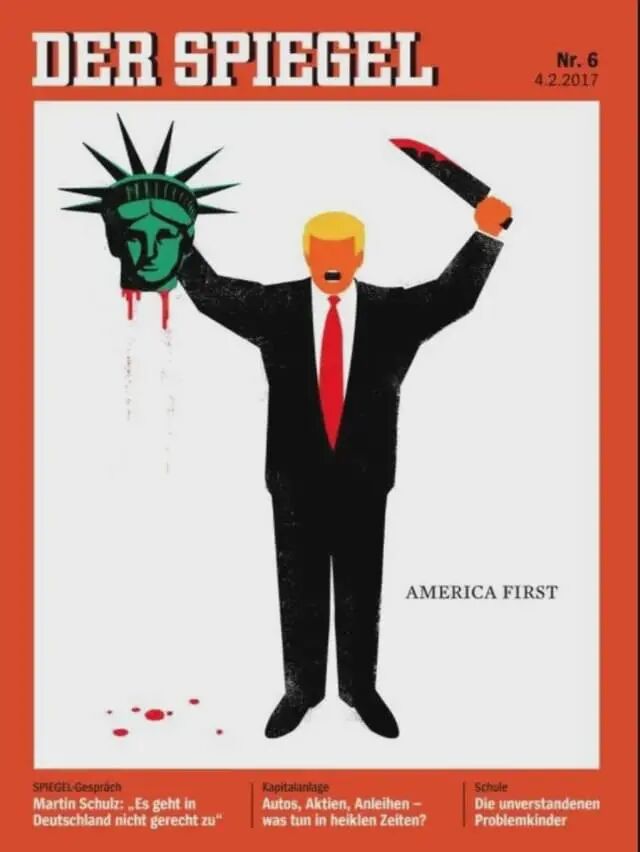 来自德国的《明镜周刊》,将他描绘成一个 割下自由女神头颅的嗜血狂热分子: