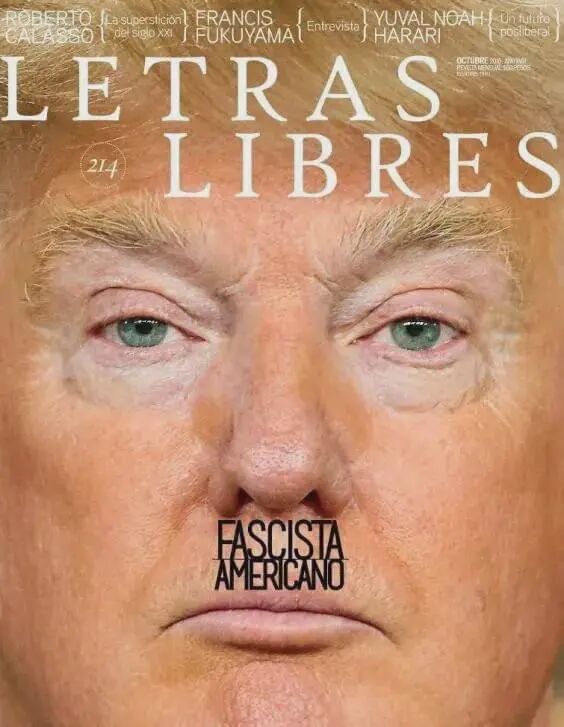 文学杂志《Letras Libres》放大了川普的一张大脸和五官,在他的鼻子下方,打上希特勒同款的小胡子,配文“美国法西斯”: