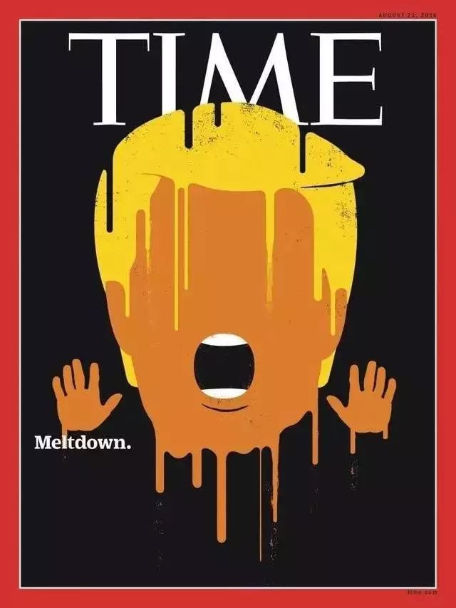 《时代周刊》更直接,它有一期封面是快要融化的川普,配文:“Meltdown”,垮台!