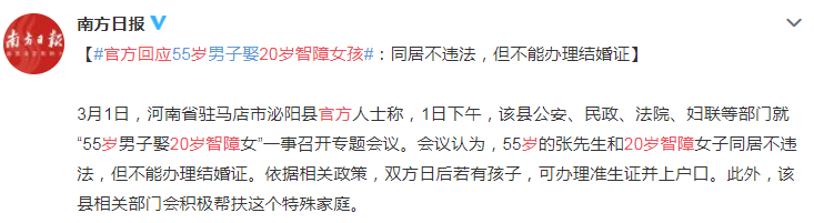 事情曝光之后,当地官方介入调查,但最后的结果是:两个人不能结婚,但同居合法,生了孩子可以上户口,以后会积极帮扶这个家庭。