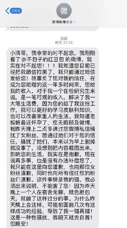 “因为疏于管理,是我的微博助理对粉丝做出了性骚扰行为”