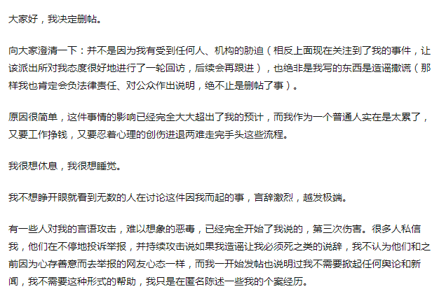 但事情的影响超出了当事人的预计,最后还是选择了删帖的决定。