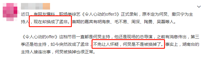 除了《快本》,何炅另外主持的真人秀《令人心动的offer》,位置也似乎被换掉,孟非代替,《明星大侦探》虽然改名,但“双北”是否能继续合体也是待定。