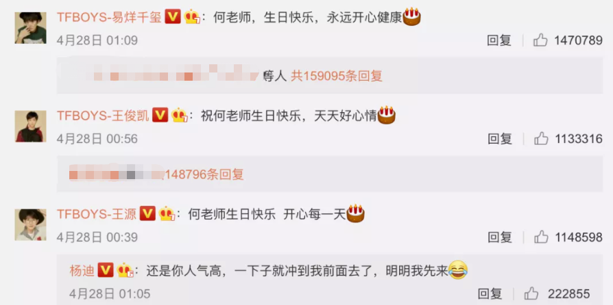 大意是何炅生日当天,明星会在微博下方送上祝福,粉丝助理冲上热评,2019年甚至超过了130位明星,评论简单破百万。