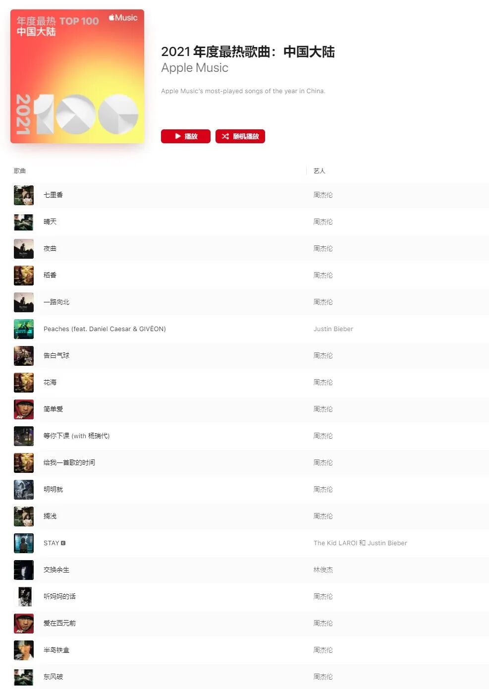 上周,一个榜单在各大微信群流传,Apple music大陆地区2021年度榜单,top100里周杰伦占比54首,top50占比42首,前十里占了9首(另一首是Justin Bieber)。