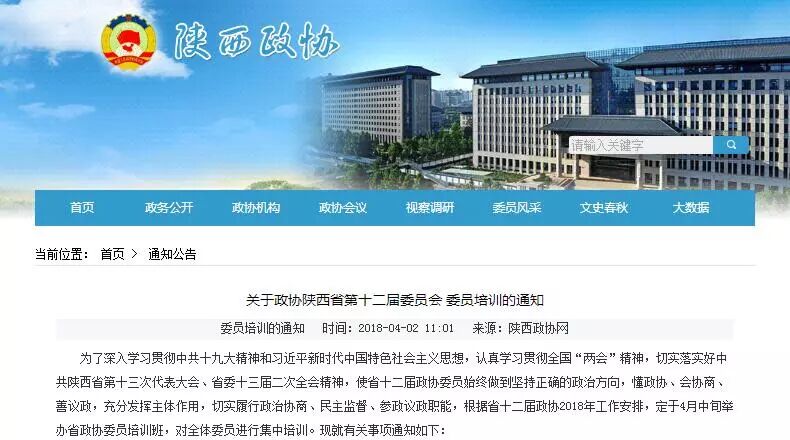 关于政协陕西省第十二届委员会委员培训的通知 根据省十二届政协2018年工作安排,定于4月中旬举办省政协委员培训班,对全体委员进行集中培训。