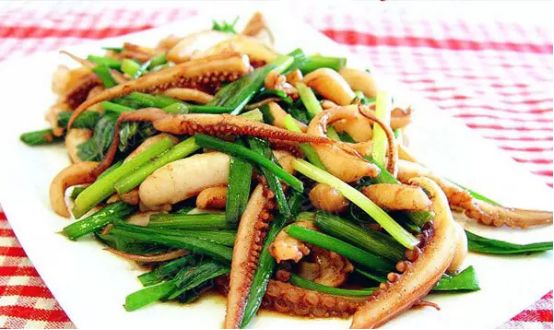 做法:1.韭菜切段,鱿鱼须切条;2.鱿鱼须过水沥干待用;3.锅内放油,下鱿鱼须大火翻炒,加酱油,精盐,味精,料酒,十三香粉煸炒;4.放入韭菜大火翻炒。