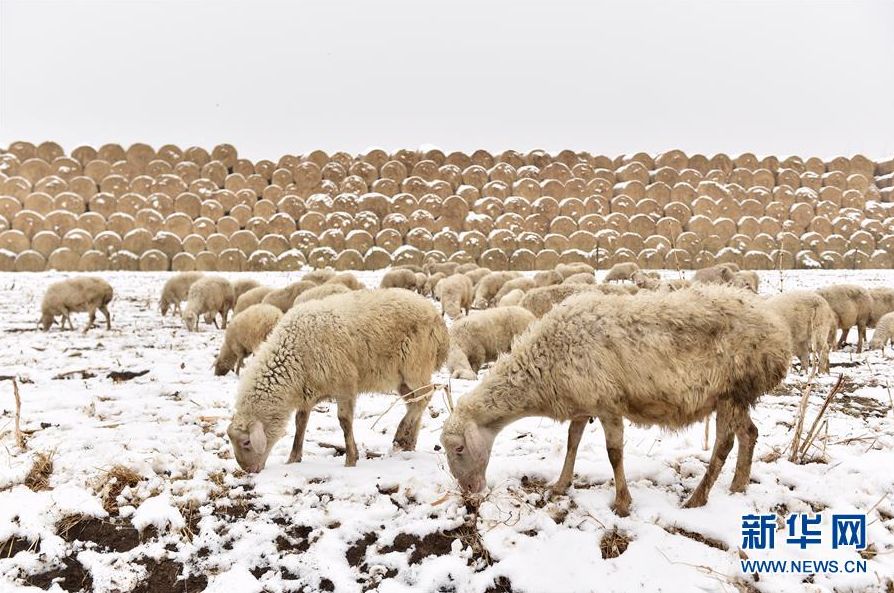4月5日,一群羊在天津宁河区一处雪地上觅食。