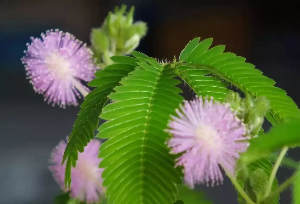 我家的阳台上长着一棵的含羞草。含羞草的叶子是椭圆形的,像小羽毛一样轻,摸上去有一点粗糙。细小的茎非常娇嫩,一滴水打在上面都可以使它弯下腰来。风一吹,含羞草在风中摆动,真像少女在翩翩起舞。椭圆形的花瓣额紫中带红,多么像一个个小绒球啊!
