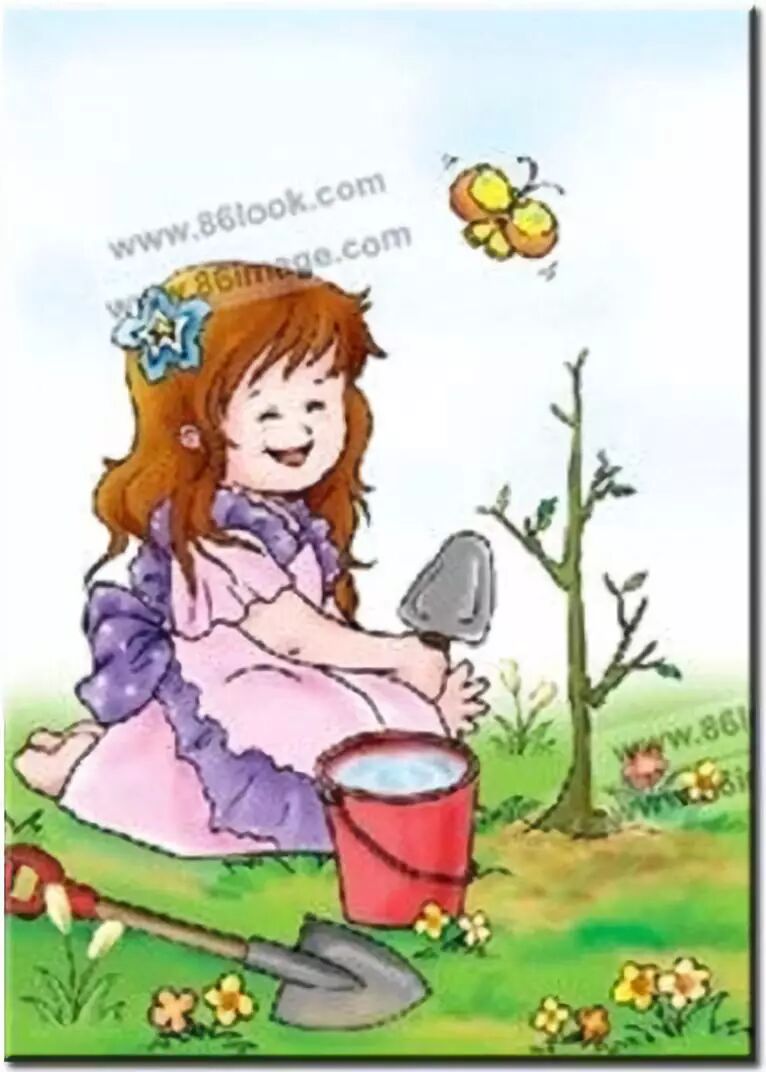 你看,小东扶着小树,兰兰培土,甜甜浇水,他们干得多认真呀!