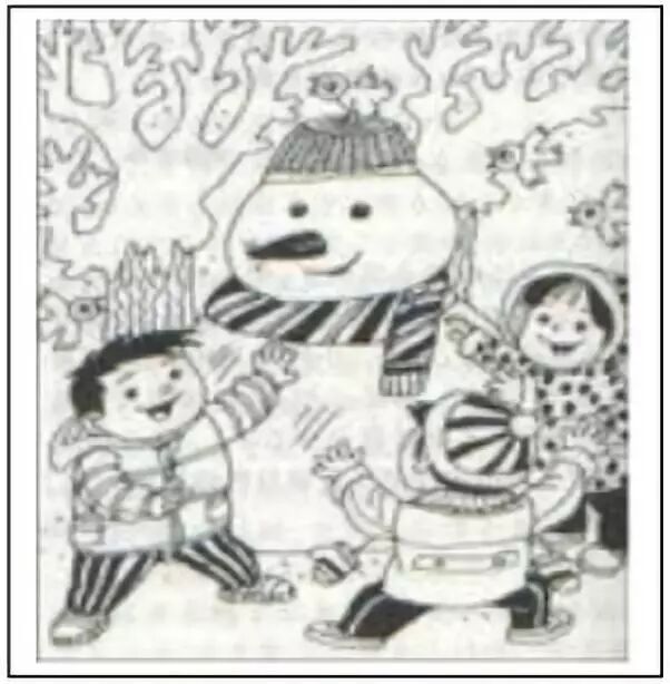 冬天到了,雪花飘满大地,小朋友们在雪地里堆雪人。雪人堆好了,小明又把自己 的帽子和围巾给它戴上。三个小伙伴围着雪人又跳又笑。瞧,他们多开心呀!